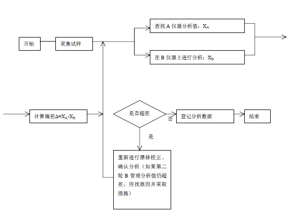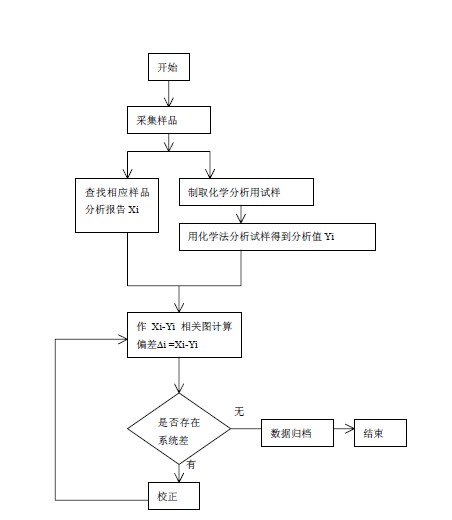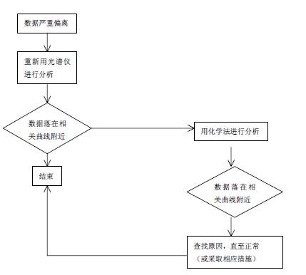 当发现存在明显系统偏差时,应进行校正,校正的方法有修改工作曲线法和ã ~ ä校正法。当相关图(偏差图)中个别试样数据严重偏离相关曲线(偏差均值)时,应按以下流程图进行处理: