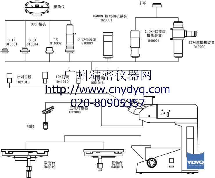 落射照明器带视场光栏、孔径光栏、起偏振片,(黄,蓝,绿)滤色片和磨砂玻璃 | ||