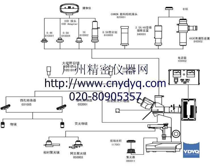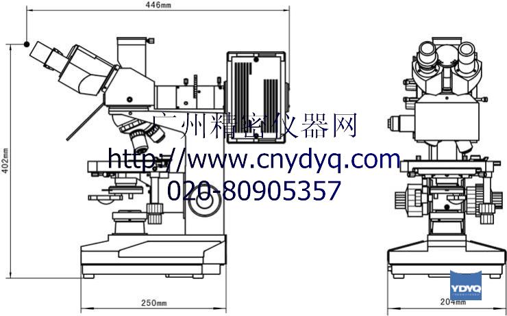 ▲ 透射照明采用6V 20W卤素灯,亮度可调;荧光落射照明采用100W高压汞灯,外置电源箱.